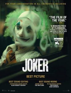 Este año, como muchos ya saben, el estudio Warner Bros junto a DC Comics, lanzaron probablemente una de las mejores películas del año, y estamos hablando de Joker (2019) dirigida por Todd Phillips y protagonizada por Joaquin Phoenix. Ayer se revelaron dos nuevos posters de la película, que forman parte de la campaña del estudio para llevar la película a los Oscar, en los cuales apuntan a todas las categorías incluyendo mejor película, mejor edición de sonido, mejor mezcla de sonido y mejor vestuario.