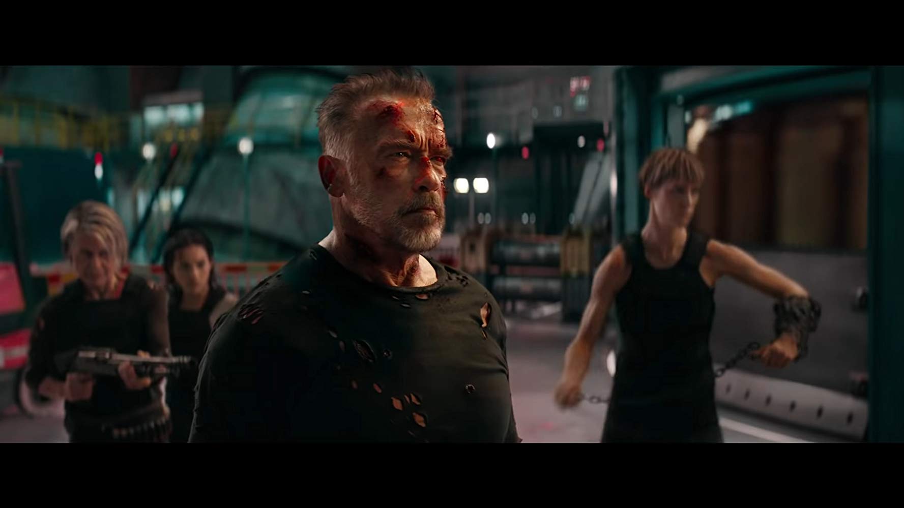 Lynda Hammilton, Natalia Reyes, Arnold Schwarzenneger y Mackenzie Davis en ¨Terminator Dark Fate¨(2019)