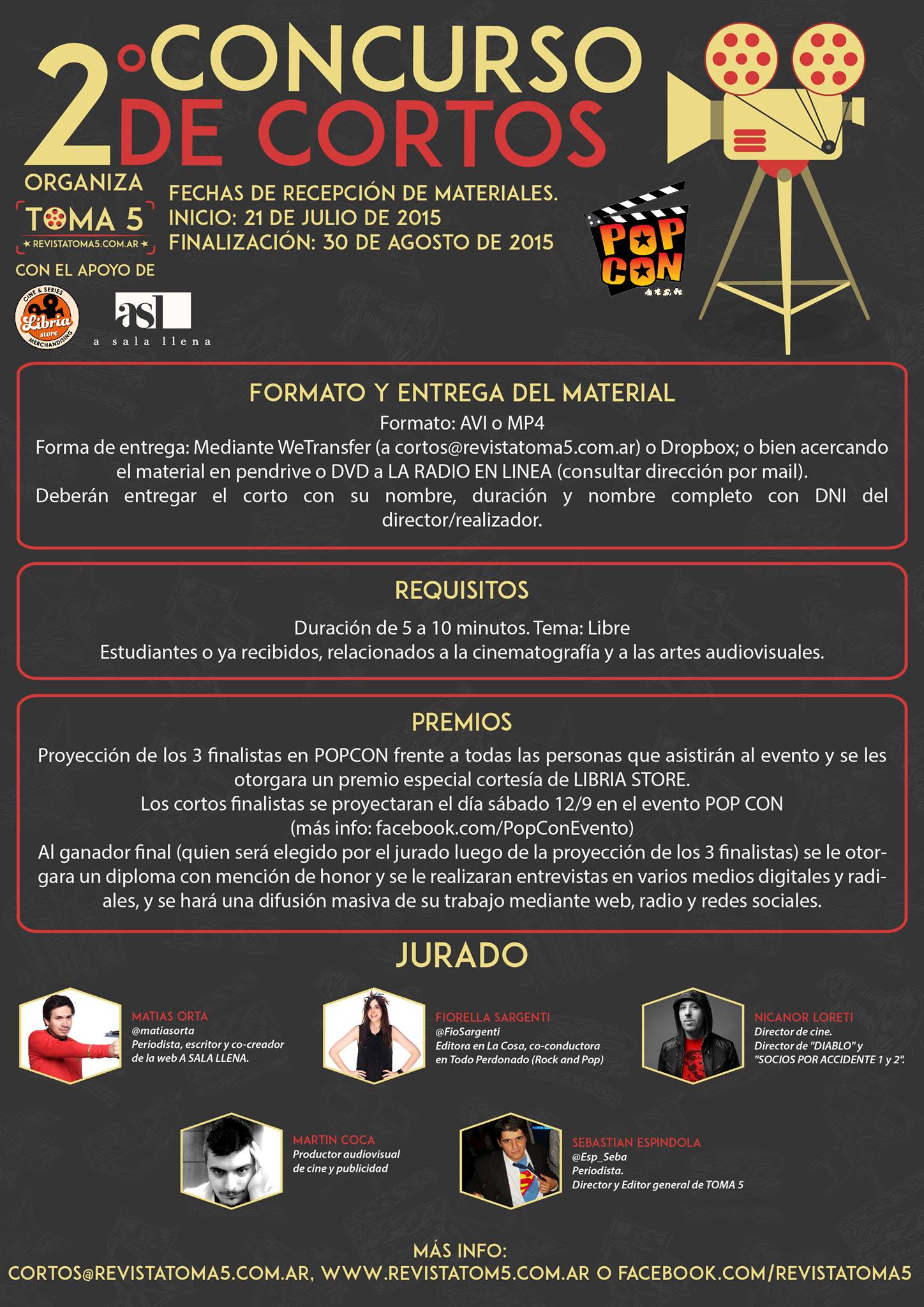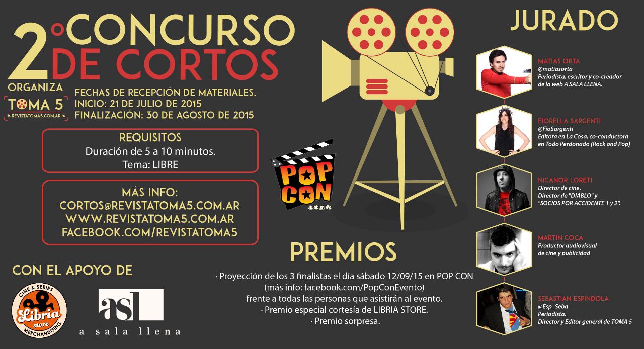 Tras el éxito de la edición celebrada el año pasado, y con el apoyo de los organizadores del evento “Pop Con” y la web de cine A Sala Llena, Revista Toma 5 lanza la segunda edición de este fabuloso concurso dedicado no solo a jóvenes y experimentados realizadores sino también a todos aquellos que tengan el coraje y las ganas de filmar su propia producción con la intención de estrenarla frente a un amplio público y bajo la atenta mirada de un jurado de lujo.